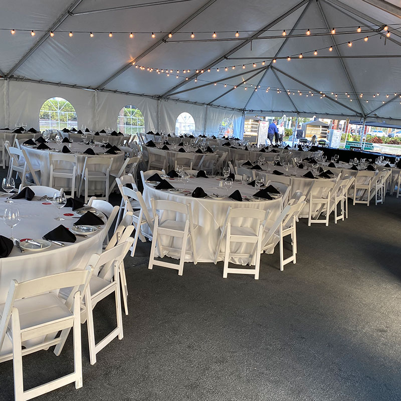 As the sun sets, string lights, lanterns, or uplighting under the tent keep the space cozy and inviting. Browse event lighting rentals to set the perfect evening mood.