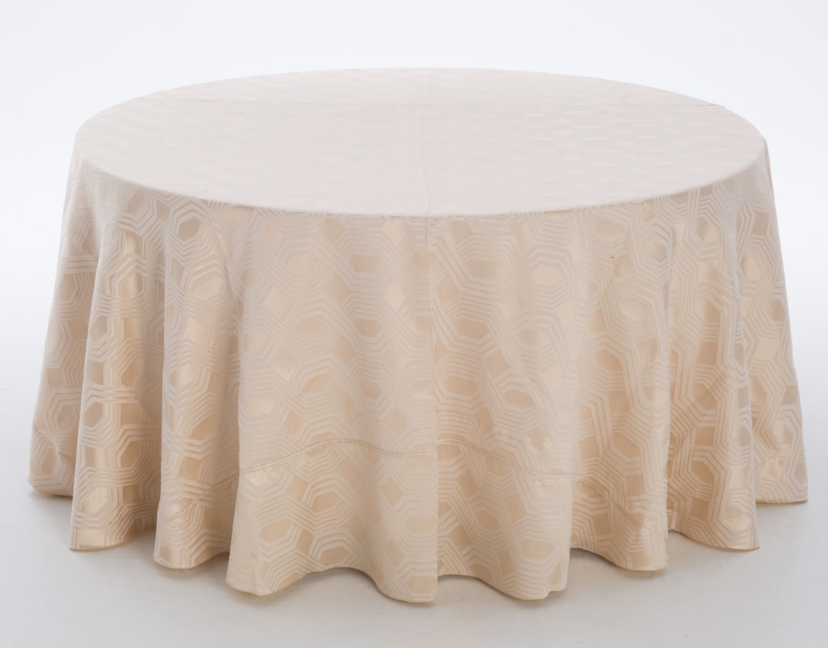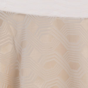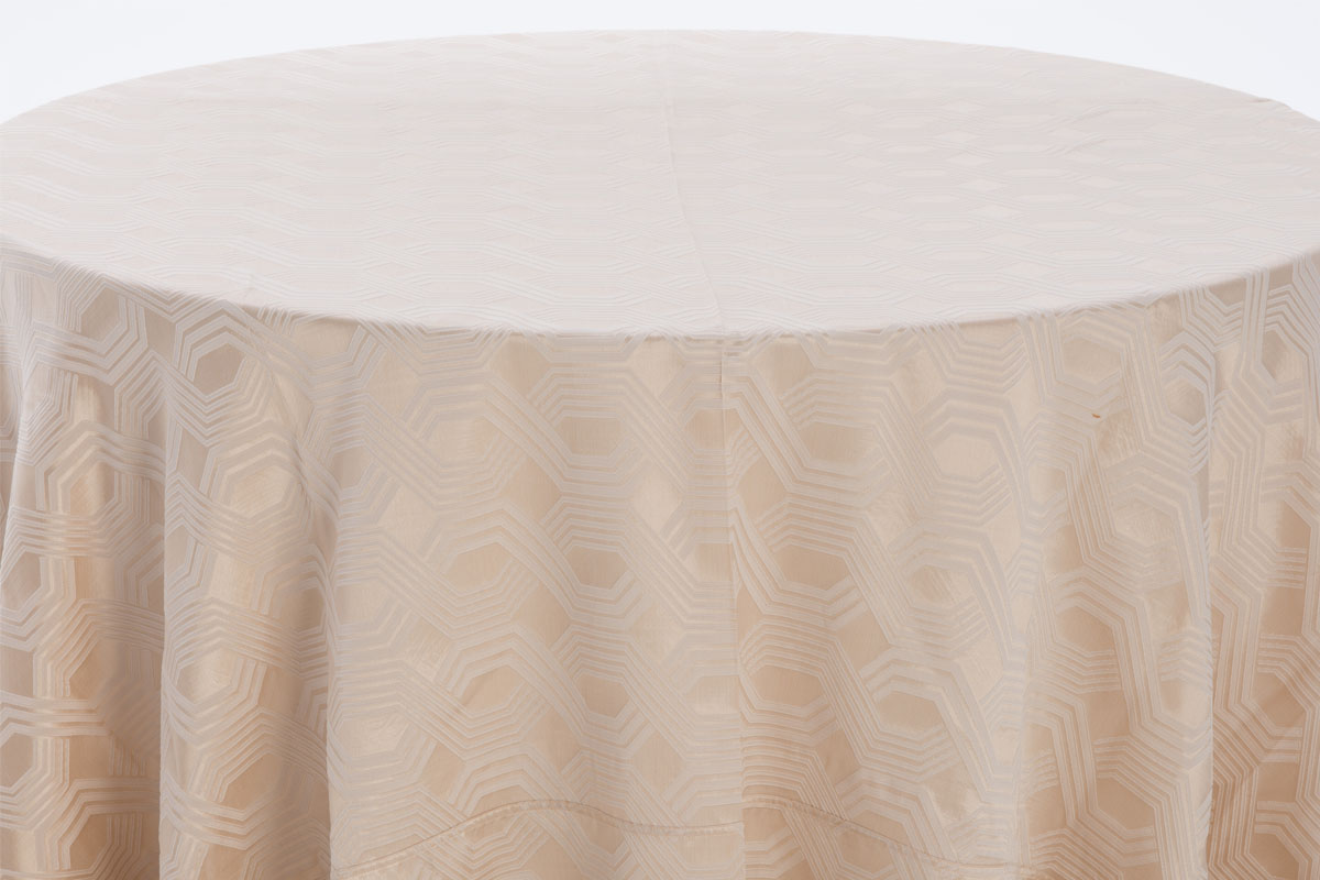 Our Geometric Taffeta Champagne is available for rent, offering an exquisite way to enhance your event with its luxurious texture and captivating color palette.